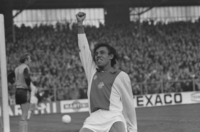 Simon Tahamata celebra un gol con la maglia dell’Ajax. Nel 1979 ricevette due punti dalla giuria del Pallone d’Oro, arrivando 21°, alla pari di Causio e René van de Kerkhof, e davanti a Panenka. Fu il primo giocatore di origine asiatica a comparire nella classifica del Pallone d’Oro.