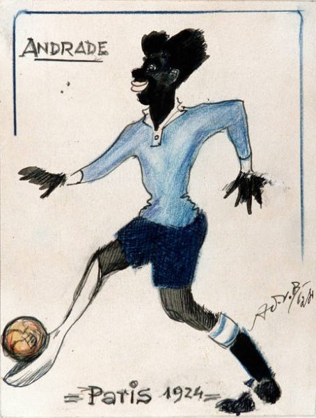 A cartoon caricature of Uruguayan footballer Jose Leandro Andrade who played for the Uruguay national football team at the 1924 Summer Olympics in Paris, France in May and June 1924. The Uruguayan team beat the Switzerland team 3-0 to win the gold medal in the final of the football tournament at the 1924 Summer Olympics…