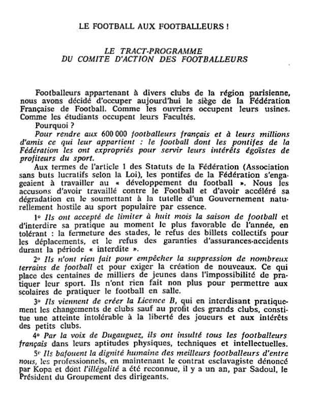 Il 22 maggio, il numero dei manifestanti in tutta la Francia aveva raggiunto quota 10 milioni. Quello stesso giorno, alle 8.00 della mattina, un gruppo di persone fece irruzione negli uffici della Fédération Française de Football in Avenue d’Iéna 60b, nel XVI Arrondissement, occupandoli. Di essi facevano parte soprattutto giocatori delle serie dilettantistiche, ma anche due professionisti – André Mérelle e Michel Oriot, ala destra e mediano, rispettivamente di 24 e 29 anni, del Red Star di Saint-Ouen, all’epoca in seconda divisione – e quattro giornalisti sportivi: François Thébaud, Francis Le Goulven, Maurice Ragonneau e Jean Norval del Miroir du Football, un mensile calcistico legato al Partito Comunista francese. Arrivati alle finestre degli uffici della FFF, le aprirono e stesero all’esterno delle bandiere rosse e due striscioni: “Il calcio ai calciatori” e “La Federazione, proprietà di 600.000 calciatori”. Il Sessantotto era arrivato al cuore del potere del calcio, un po’ come se gli scioperanti di Parigi fossero riusciti a occupare l’Eliseo.